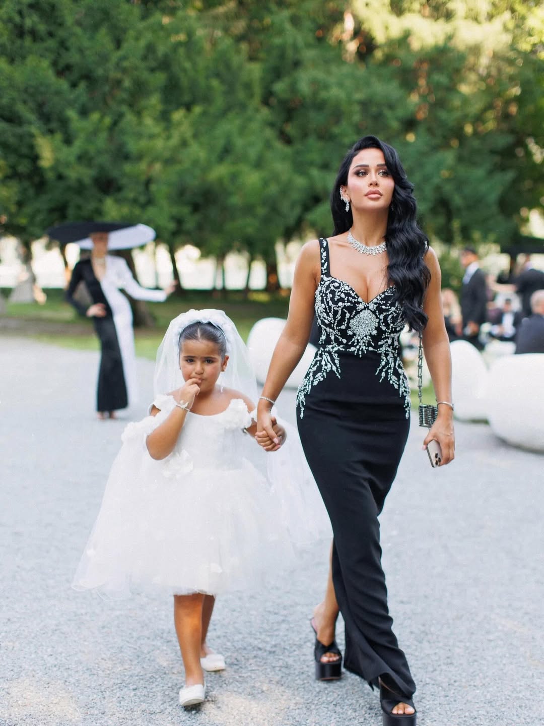 اختارت التيك توكر رين خوري، خلال حفل زفاف شقيقتها صانعة المحتوى الشهيرة بلقب "الدكتورة يومي" فستاناً أسود أنيقاً، يجمع بين الكلاسيكية واللمسات العصرية، بتصميم مجسّم يبرز جسمها الممشوق، وتميّز بقصّته البسيطة، فجاء من الأعلى بشك دقيق بحبيبات اللؤلؤ والستراس متعددة الأحجام مع حمّالات رفيعة مطرّزة أيضاً لتشكل لوحة فنية جميلة، وينسدل الفستان الضيق من الأسفل مع فُتحة عالية من الخلف. وأكملت رين إطلالاتها بمجوهرات ماسية فاخرة أضافت المزيد من الفخامة والرقي الى طلّتها النهائية.