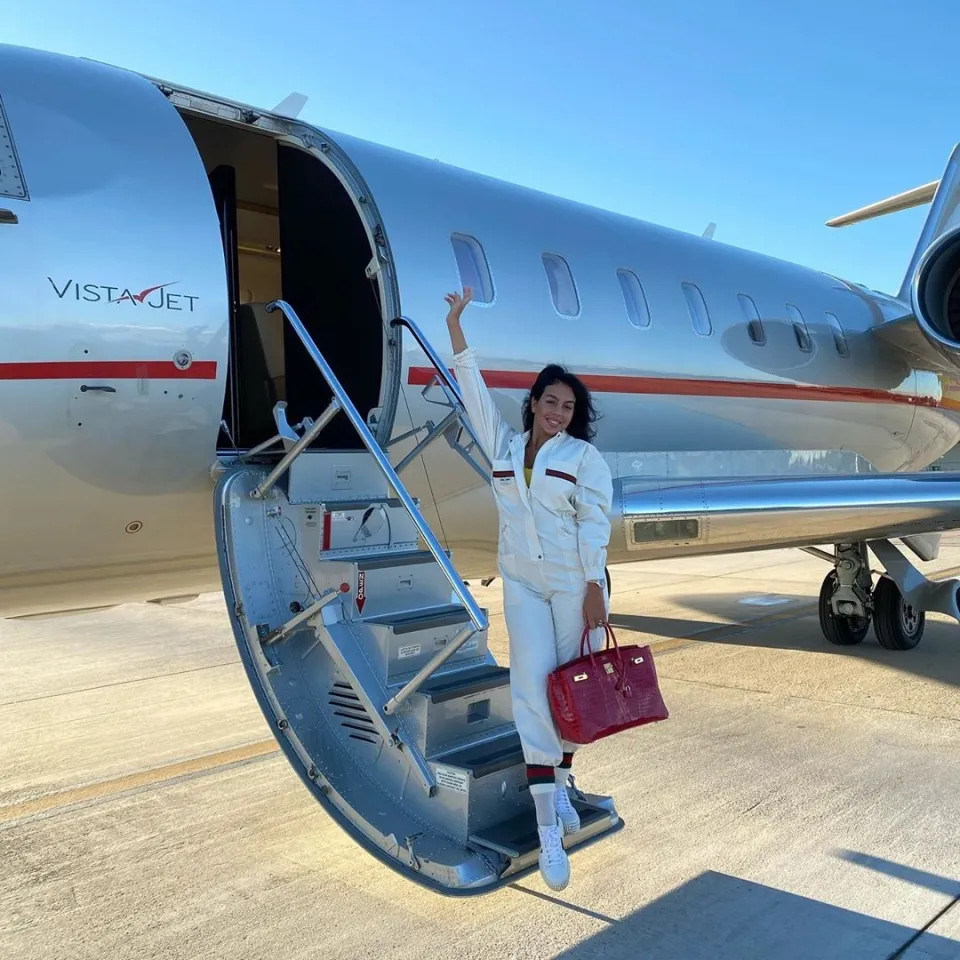 جورجينا رودريغيز امام طائرة رونالدو الخاصة