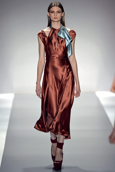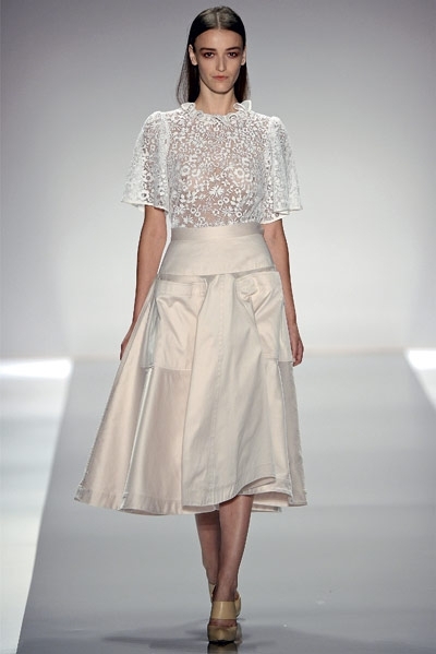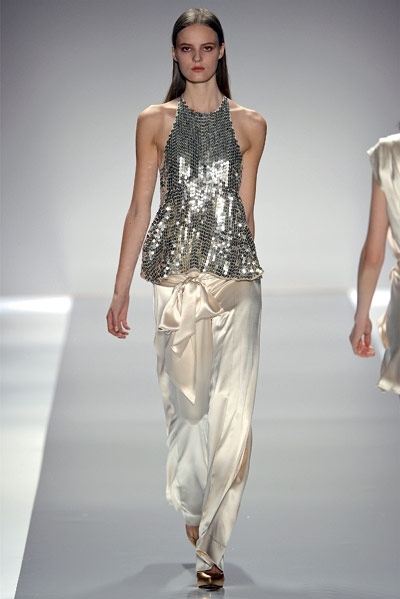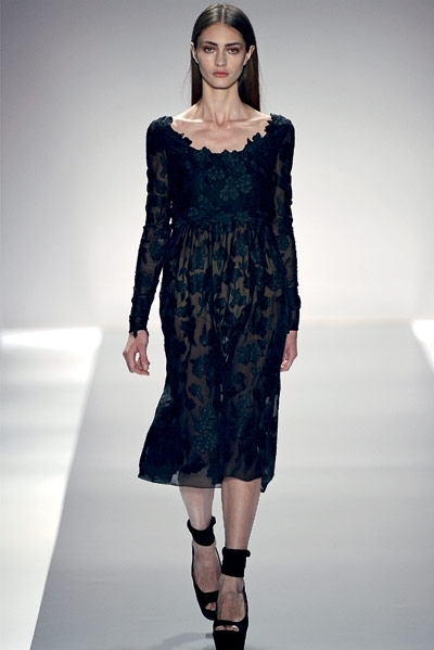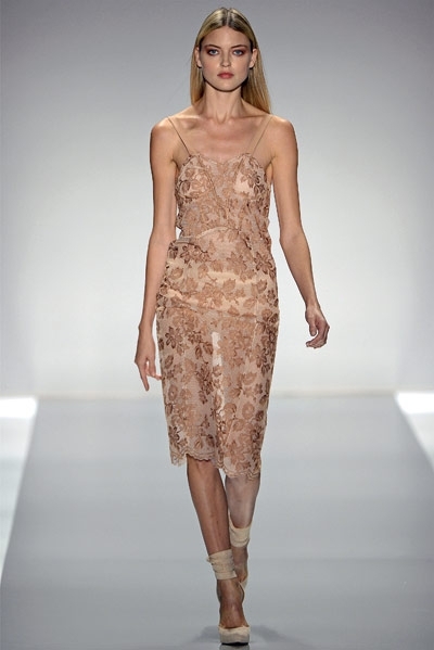فساتين دانتيل مخرّمة باللون الأسود، وأخرى ورديّة أو بلون البيج. المجموعة رقيقة جدّاً. سترات وفساتين من الساتين الأسود المطبوع بالورود. التصاميم التي أتت باللون أبيض بغاية الرومانسيّة... ولنهاية العرض فساتين للسهرة طويلة بيج من الدانتيل أو بقماش لمّاع أو مع ثنيات.