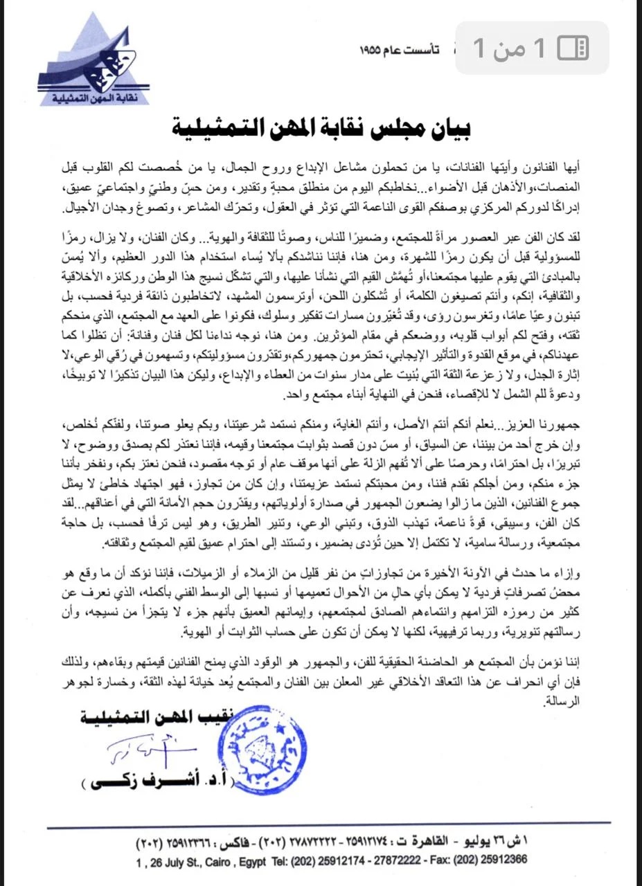 وأردف أشرف زكي بالقول: "جمهورنا العزيز... نعلم أنكم أنتم الأصل، وأنتم الغاية، ومنكم نستمد شرعيتنا، وبكم يعلو صوتنا، ولفنكم نُخلص وإن خرج أحد من بيننا، عن السياق، أو من دون قصد بثوابت مجتمعنا وقيمه، فإننا نعتذر لكم بصدق ووضوح، لا تبريراً، بل احتراماً، وحرصاً على ألا تفهم الزلة على أنها موقف عام أو توجه مقصود، فنحن نعتز بكم، ونفخر بأننا جزء منكم، ومن أجلكم نقدّم فننا، ومن محبتكم نستمد عزيمتنا، وإن كان من تجاوز، فهو اجتهاد خاطئ لا يمثل جموع الفنانين، الذين ما زالوا يضعون الجمهور في صدارة أولوياتهم، ويقدّرون حجم الأمانة التي في أعناقهم... لقد كان الفن، وسيبقى، قوة ناعمة، تهذب الذوق، وتبني الوعي، وتنير الطريق، وهو ليس ترفاً فحسب، بل حاجة مجتمعية، ورسالة سامية، لا تكتمل إلا حين تؤدى بضمير، وتستند الى احترام عميق لقيم المجتمع وثقافته".