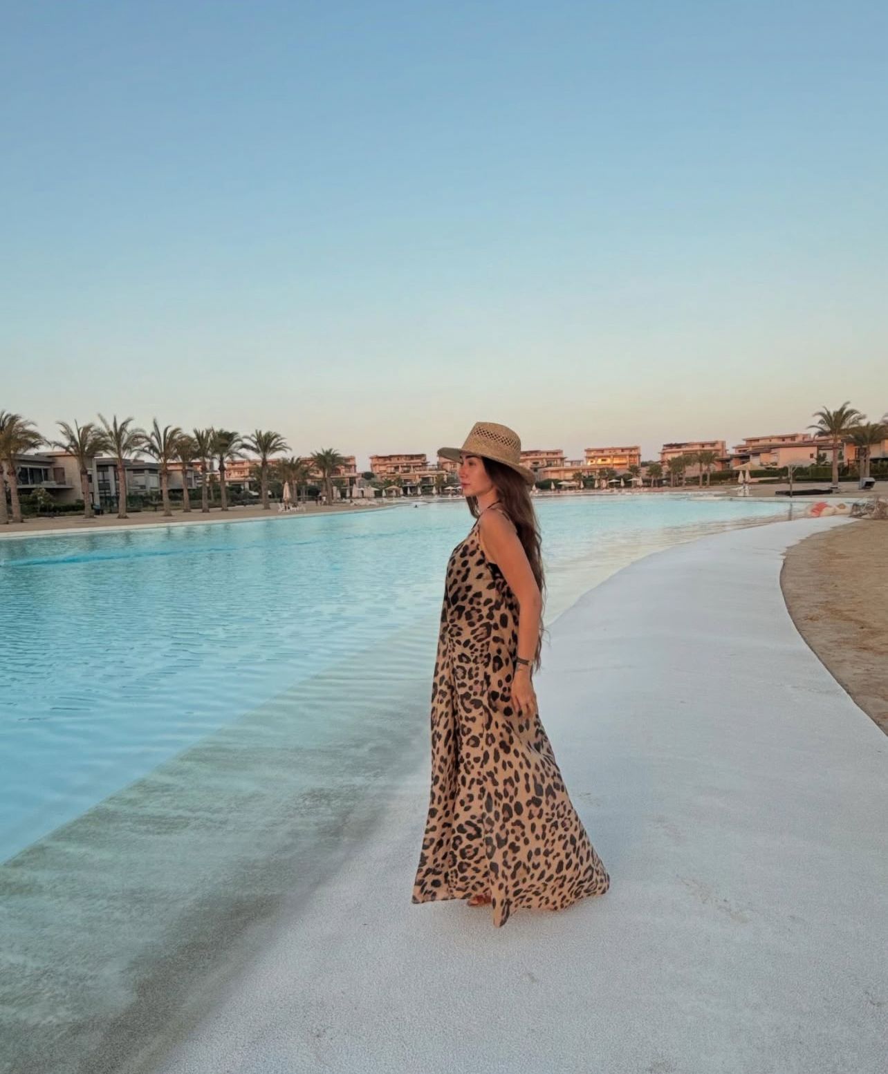 2. فستان ليوبارد طويل مع قبّعة القش: جرأة ناعمة بروح صيفية