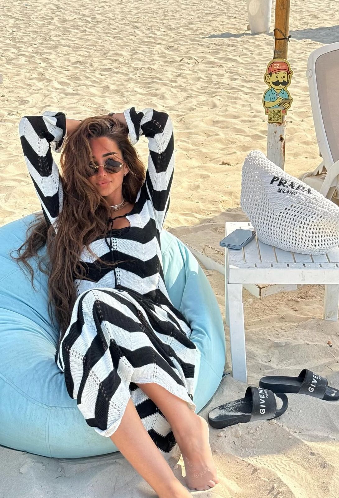 في إطلالة أخرى، تألقت هنا بفستان بحري طويل مقلّم بالأبيض والأسود، يعكس مظهراً كلاسيكياً مع لمسة صيفية مريحة. هذا النوع من الفساتين يُعتبر خياراً عملياً لمن تبحث عن إطلالة بسيطة لكن لافتة. وقد أضفت هنا رونقاً خاصاً على الإطلالة من خلال تسريحة شعر مفرودة ونظّارات شمسية كبيرة، لتظهر بإطلالة تنبض بالحيوية.