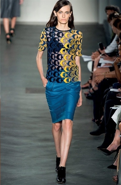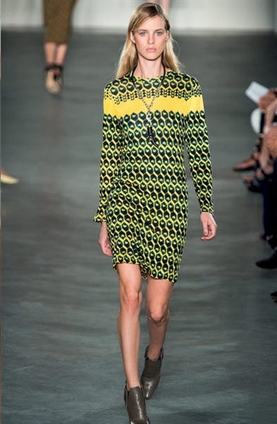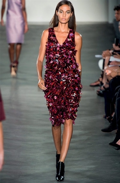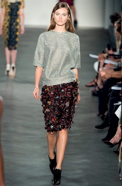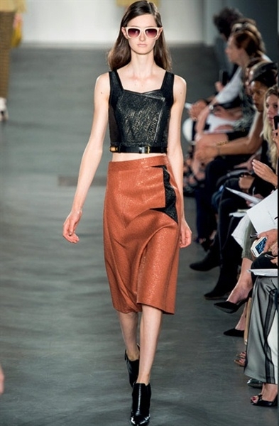 الجلد في المجموعة بألوان مختلفة من أزرق ورماديّ وأخضر مع مزيج من الصوف المحبوك. في العرض لفتت نظري «بوستييه» قصيرة ملونة وأخرى بالأسود. Derek Lam ختم العرض بتصاميم مشكوكة بقطع كبيرة من المرايا باللون الأحمر.