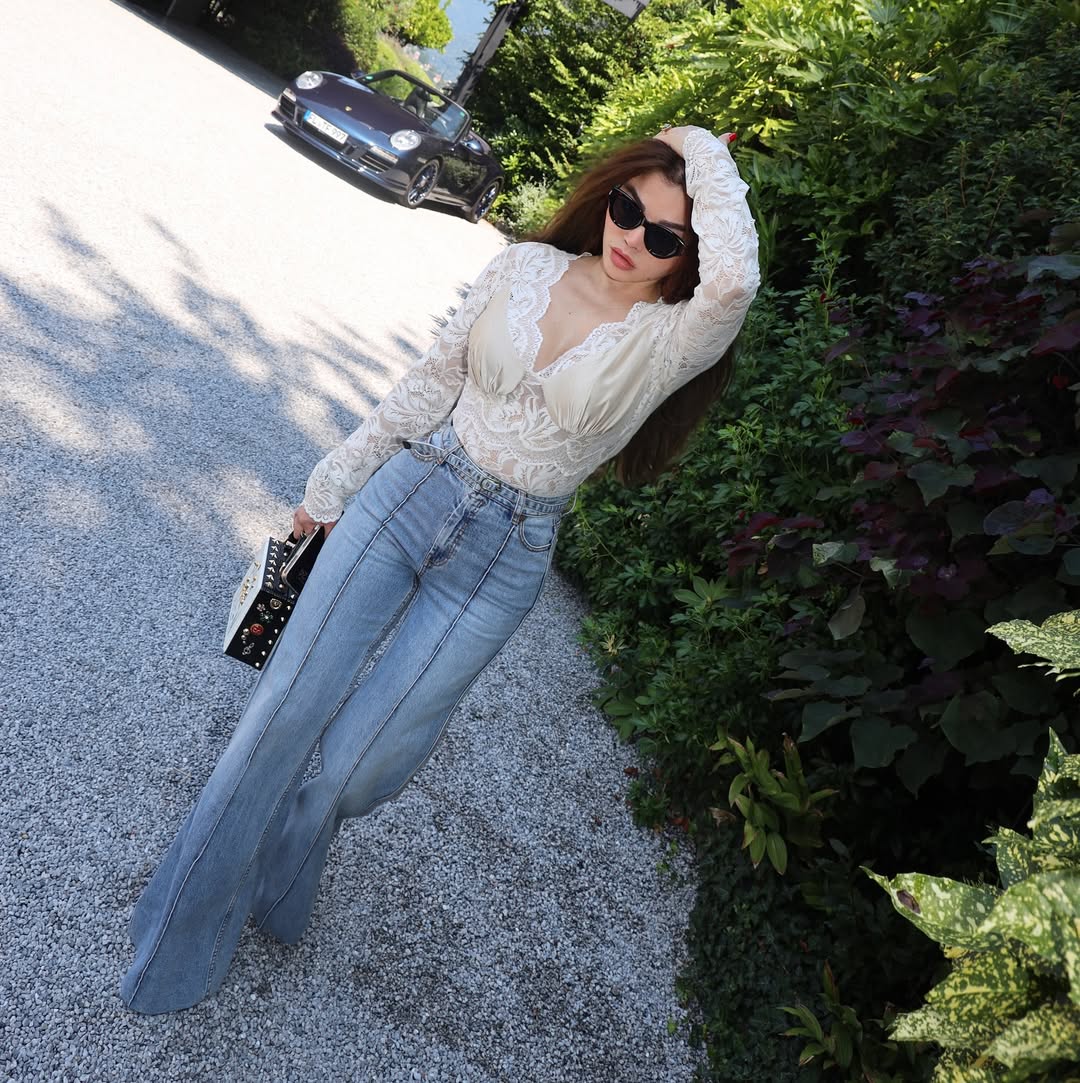 وخطفت النجمة اللبنانية الأنظار بإطلالتها البسيطة التي اختارتها ونسقتها بعناية، وجاءت عبارة عن "بادي دانتيل" أنيقة من دار Rabanne بتصميم كورسيه أنيق بأكمام طويلة، وتميّز بالساتان البارز عند منطقة الصدر والدانتيل الجريء بتطريزات أنيقة، ونسقت معها بنطال جينز بتصميم أنيق وأقدام واسعة من دار Zimmermann.