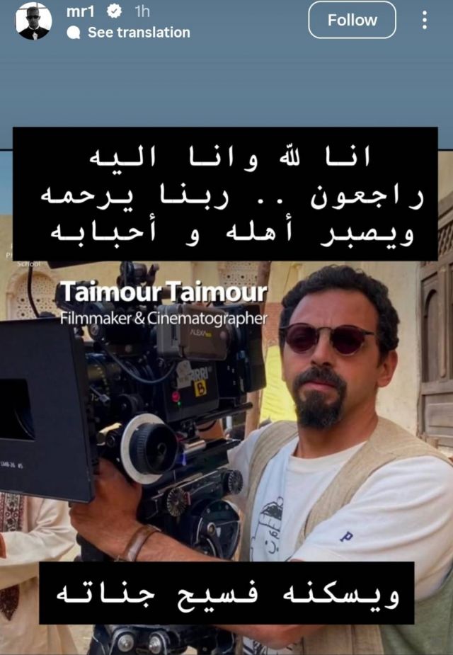 وشكل رحيل الشاب الذي يعد واحدا من أبرز مديري التصوير خلال السنوات الأخيرة، وتعاون مع أهم المخرجين في مصر صدمة كبيرة في الوسط الفني وحرص عدد كبير من النجوم على نعي تيمور تيمور عبر السوشيال ميديا، ابرزهم النجمة ياسمين عبد العزيز التي نشرت صورتها مع الراحل وارفقتها بتعليق جاء فيه "لا إله الا الله أطيب قلب ومن أجدع الناس اللي قابلتهم في حياتي، الرجاء الدعاء لتيمور بالرحمة ولأهله وأولاده ولينا بالصبر".