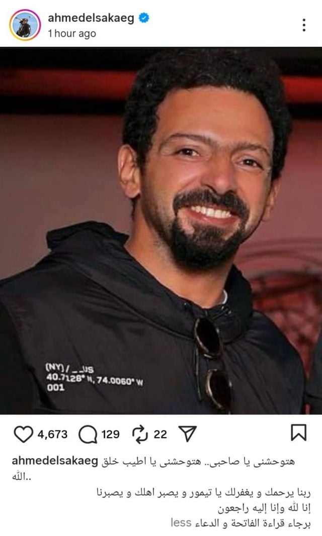 وكتب النجم احمد السقا عبر انستغرام "حتوحشني يا صاحبي حتوحشني يا اطيب خلق الله، ربنا يرحمك ويغفرلك ويصبر أهلك ويصبرنا".