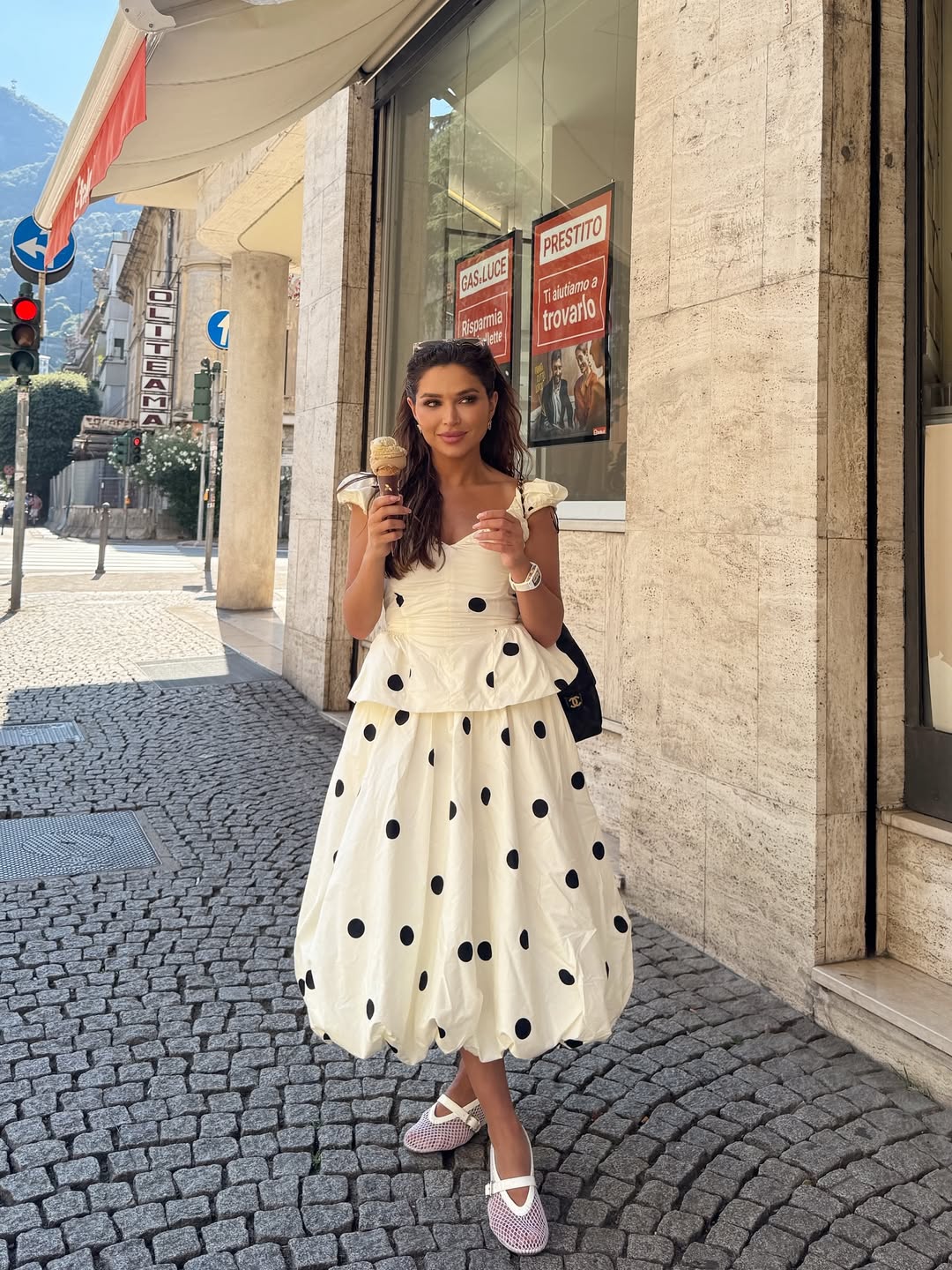 نهى نبيل شاركت جمهورها بصور عفوية أثناء تجولها في إيطاليا وتألقت بملابس صيفية مريحة، حيث أطلّت بفستان ميدي بأطراف منتفخة باللون الأبيض، مطبّع بنقاط البولكا السوداء، مع تصميم كورسيه ذي حواف بارزة من الأعلى مع أكمام قصيرة مطاطية، وفُتحة ياقة واسعة، وأكملت نهى طلّتها بحقيبة كتف من الجلد الأسود، مع حذاء الباليرينا الشبكي باللون الأبيض.