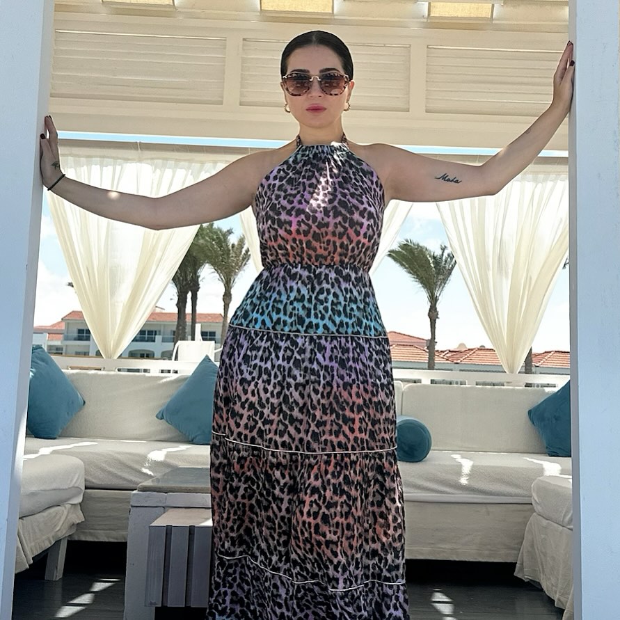 وفي أحدث ظهور لها،شاركت النجمة المصرية متابعيها على انستغرام بصورة عفوية، وتألقت بفستان صيفي أنيق، بنقشة "التايجر" بألوان صيفية زاهية، وتميّز بتصميمه الضيف مع قبة دائرية من الأعلى لينسدل بتنورة ماكسي طويلة بكشاكش ناعمة من الأسفل.