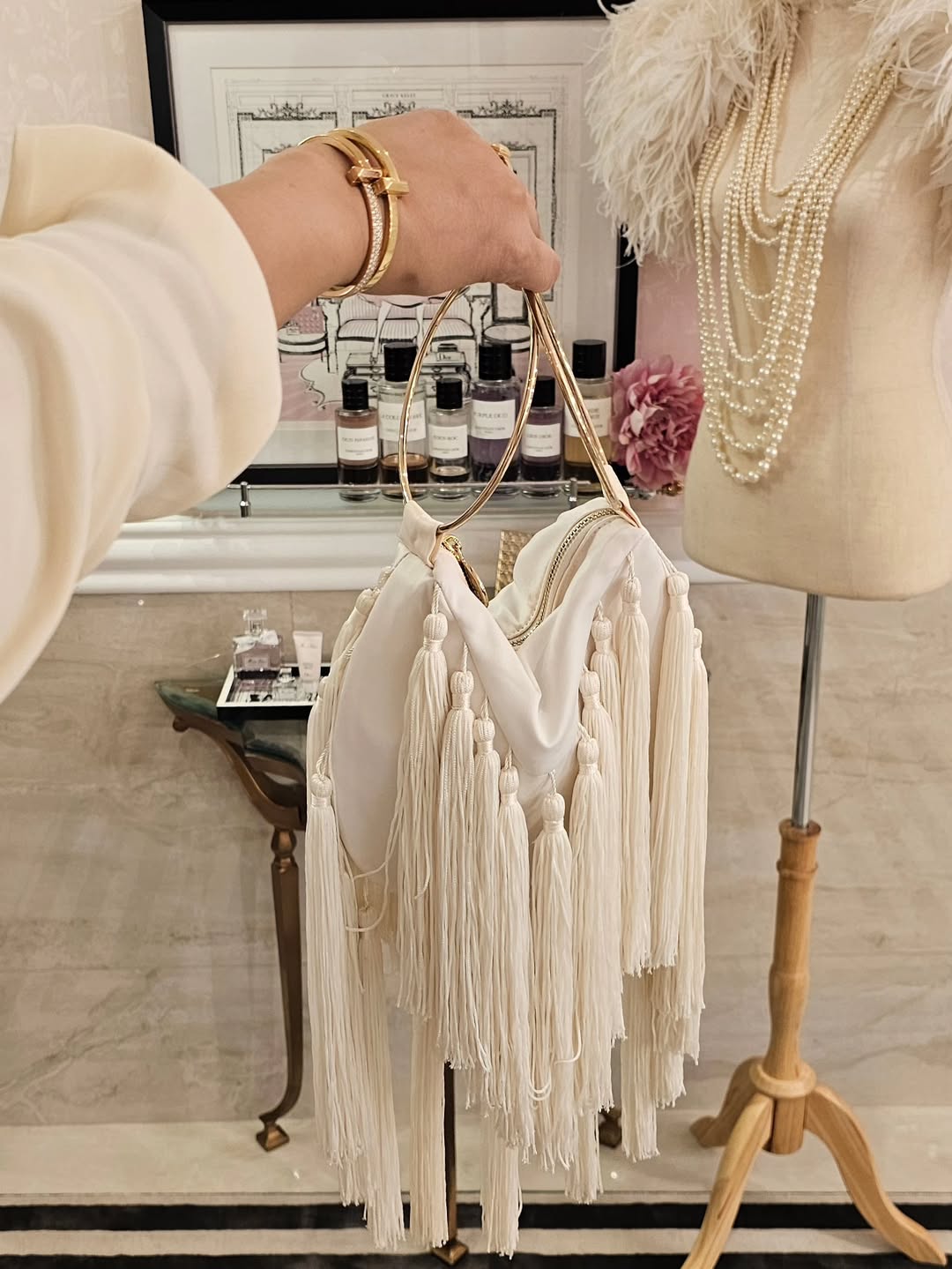 ونسقت لجين إطلالتها بأكسسوارات مميّزة اختارتها بعناية، فانتعلت حذاء نسائي أنيق بكعب عال، مفتوح من الخلف باللون البيج، وحملت بيدها حقيبة مميّزة باللون نفسه بمسكة ذهبية بشكل دائري وينسدل منها شراريب على شكل جديلات رفيعة في تصميم رائع يناسب إطلالتها.