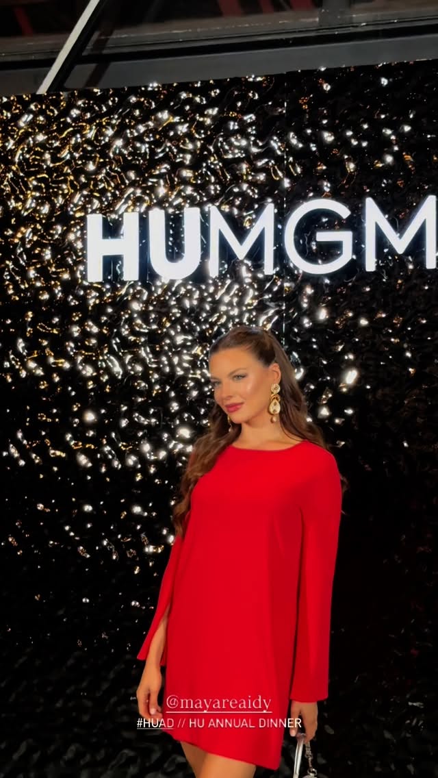اختارت مايا رعيدي فستانًا قصيرًا واسع القصة باللون الأحمر الناري، مزوّدًا بأكمام طويلة. الإطلالة جمعت بين الحيوية والنعومة، وعكست طاقة صيفية متجددة تليق بأجواء الحفل.