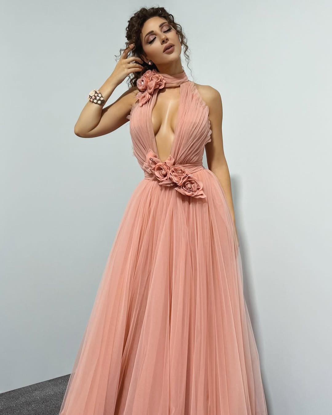 ارتدت ميريام فستاناً ناعماً بلون الباستيل، تزيّنه ورود ثلاثية الأبعاد بارزة الحجم تغطي جزءاً كبيراً من التصميم. على الرغم من نعومة الألوان، جاءت الإطلالة جريئة بفضل التفاصيل البارزة والتصميم غير التقليدي الذي يلفت الأنظار.