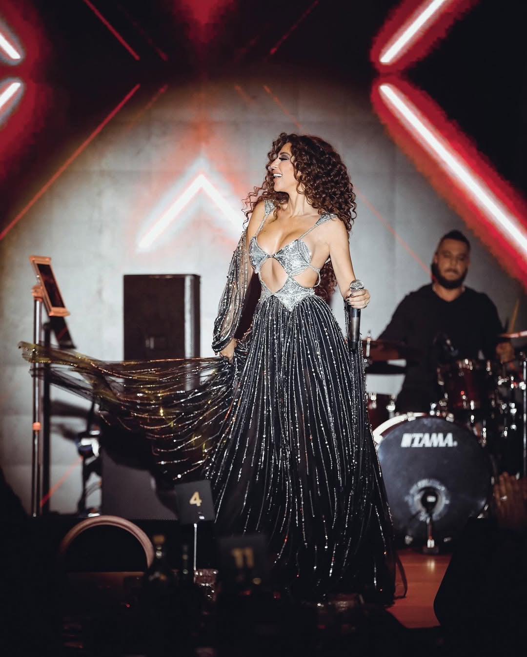في ظهورها في فيديو كليب أو حفل، ارتدت فستاناً يكاد يُشبه "البراليت" اللامع، بتفاصيل فضية برّاقة تكشف منطقة البطن. الإطلالة صُمّمت لتكون عرضاً بصرياً جريئاً يُظهر الشخصية الاستعراضية التي تتمتع بها ميريام.