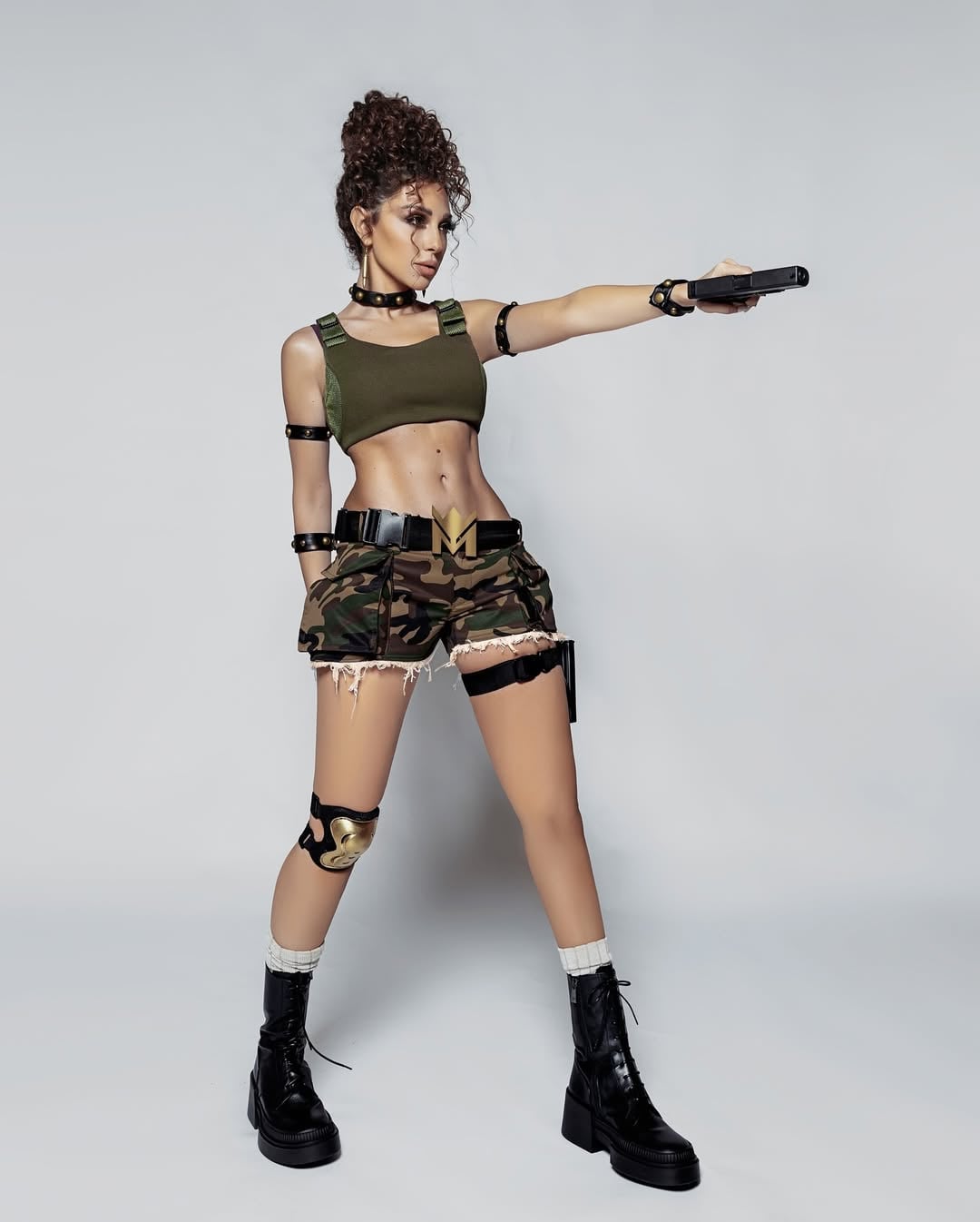 في لوك غير تقليدي، تألقت ميريام بتصميم مستوحى من الطابع العسكري، يتألف من كروب توب ضيّق وشورت قصير جداً. أكملت الإطلالة بشعر مرفوع ومكياج قوي. إطلالة جريئة ودرامية جسّدت القوة والأنوثة معاً.