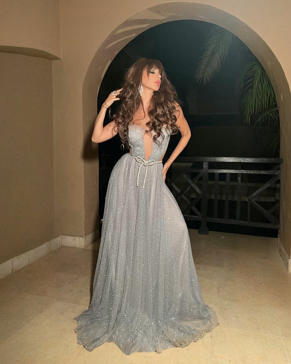 أطلّت بفستان فضي لامع بقصة الكورسيه من الأعلى، يُبرز الخصر والصدر، بينما الجزء السفلي كان واسعاً قليلاً لإضفاء التوازن. إطلالة تشبه نجمات هوليوود على السجادة الحمراء، حيث الفخامة تلتقي مع الجرأة بلا خوف.