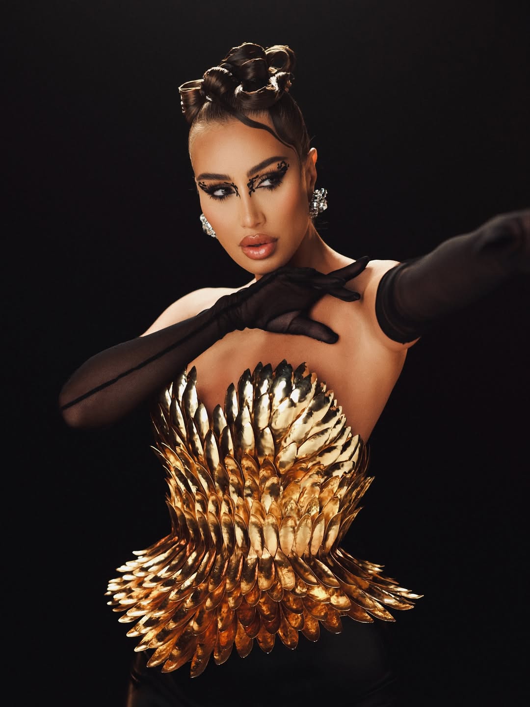 مايا دياب – توب كورسيه معدني ذهبي ستربلس: درع أنثوي بامتياز