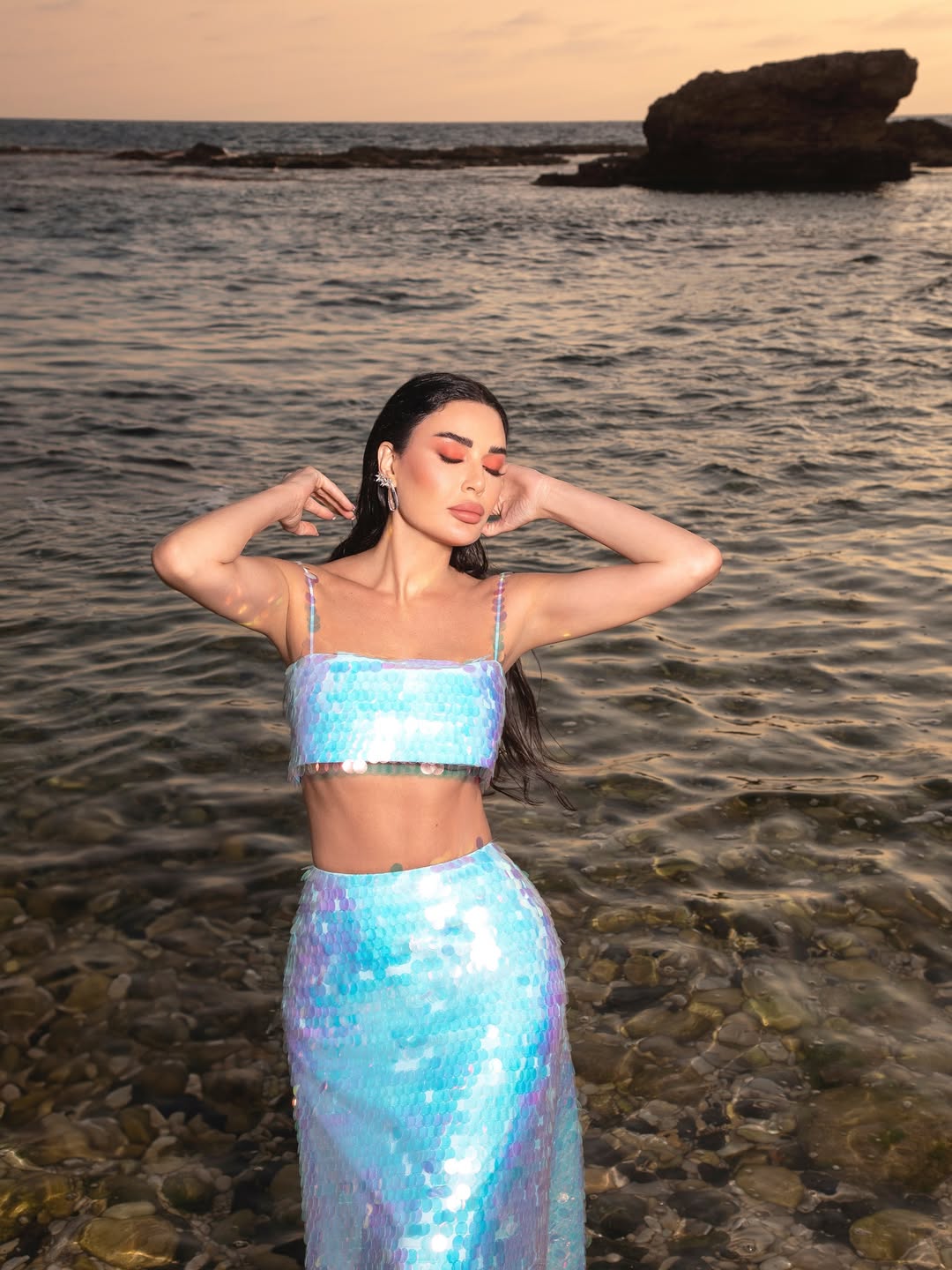 سيرين عبد النور – كروب توب وتنورة ترتر زرقاء بأسلوب حورية البحر: أناقة أسطورية