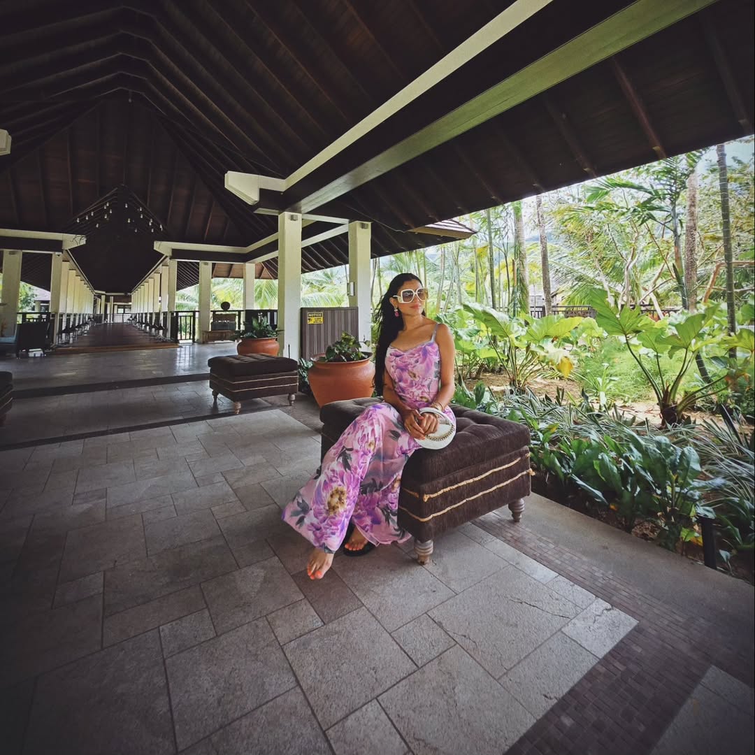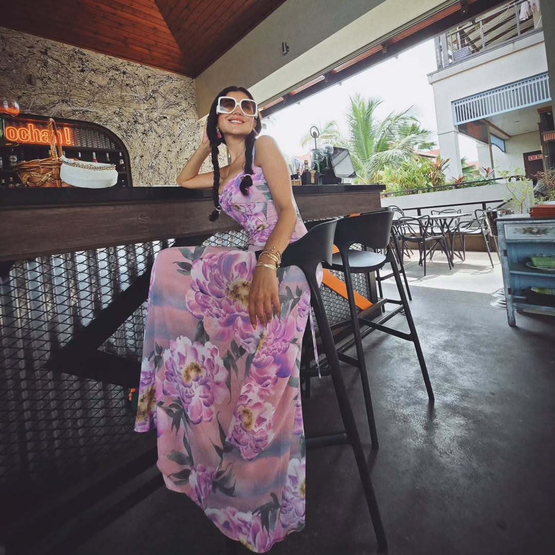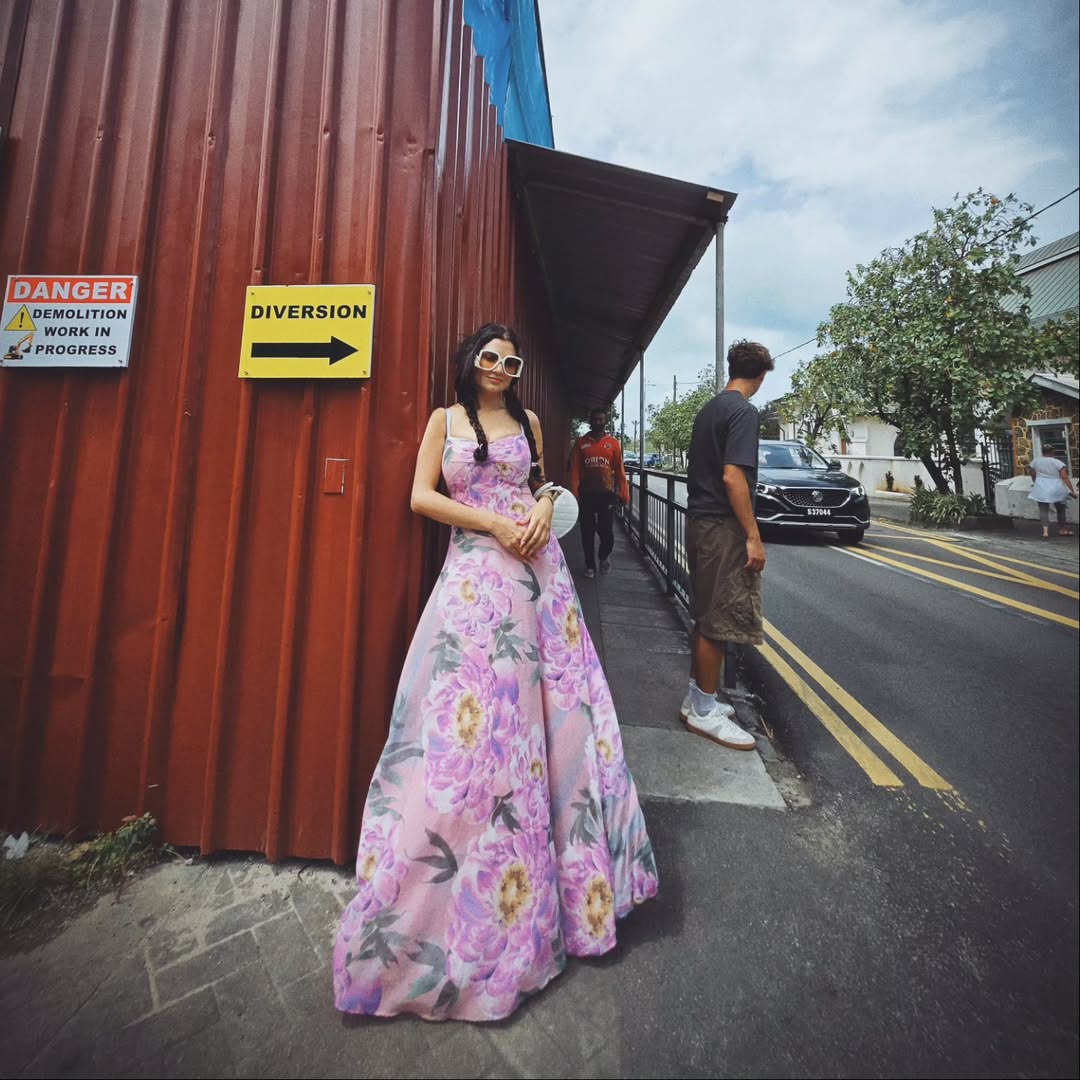 في أحدث ظهور لها، تألقت مي بفستان طويل باللون الزهري الباستيلي، تزيّنه نقوش ورود ملونة بارزة منحت الإطلالة طابعاً حالماً ومنعشاً. تصميم الفستان جاء انسيابياً يعكس خفة الصيف، مع لمسات رومانسية جعلته مثالياً للنهار أو لنزهة على الشاطئ.