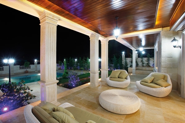 الحديقة تألقت بإنارة المصابيح من الحديد الأسود. الجولة في الخارج إكتملت مع حوض السباحة الكبير المزيّن بالشتول الخضر والإنارة الكثيرة.