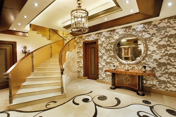 الداخل فسيح يضجّ بالعراقة، لذا هو يميل إلى الكلاسيكية أكثر منه إلى العصرية. قاعة الإستقبال مزيج من الطرازين مليئة بالتفاصيل الهندسية التي تجعل منها مكاناً صاخباً. الرسوم السود على الرخام الأبيض قابلتها رسوم مذهّبة على ورق أحد الجدران، وفي وسطه مرآة شبه دائرية، إطارها مزخرف، تعلو كونسول من الخشب متناسقا مع الخشب الموشّى للباب من الداخل. هنا، تلعب الردهة دور موزّع، فإما أن ندخل لجهة اليسار مباشرة من دون باب فاصل إلى قاعات الإستقبال، وإما على الدرج صعوداً إلى غرف النوم.