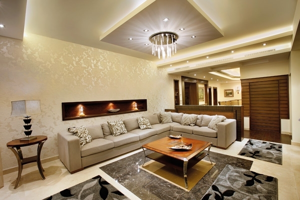 اللمعة العصرية موجودة في غرفة الجلوس، حيث المقعد الوثير من القطن البيج، وهو متّصل الأجزاء، خلفه ورق الجدران بنفحة كلاسيكية كما طراز الطاولة في الوسط.