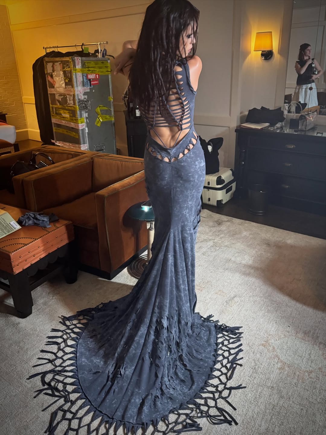 سارت أورتيغا على السجادة الحمراء بفستان مُغطّى بالفُتحات، مُزيّن بعقدة وتفاصيل مُمزقة. امتد ذيل الفستان المُمزق إلى الأرض، بينما ارتدت تحته صدرية سوداء من الدانتيل.