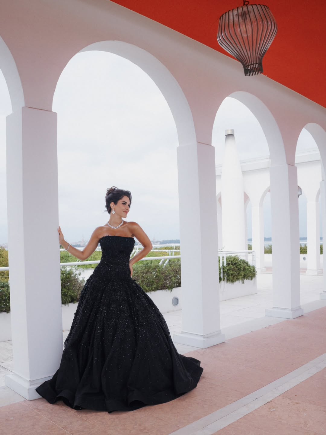 من الخليج إلى فينيسيا، حضرت نجود الرميحي بثقة فاجأت الجميع. فستان Ballroom من تصميم رامي قاضي، حمل توقيعه الواضح: البريق، الدقة، والتوازن بين الجرأة والرقي. تطريز لامع يروي قصة حرفية عالية، ومجوهرات Roberto Coin أضافت بعداً آخر للفخامة. نجود لم تحاول التشبه بأحد كانت ببساطة هي، ولكن بنسخة تتحدث لغة السجادة الحمراء العالمية.