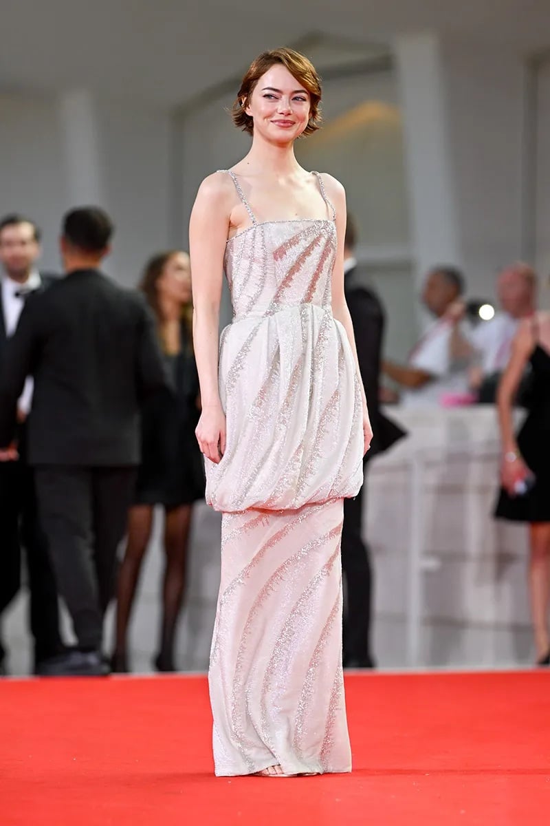 إطلالة إيما ستون لم تكن فستاناً بقدر ما كانت قطعة فنية. التصميم غير التقليدي من Louis Vuitton مزج بين الأبيض النقي واللمعان الذكي للترتر، في طبقات غير متوقعة وكأنها تقول: "أنا جزء من فيلم، لكنني لست الشخصية النمطية". حضورها كان مشبعاً بالتجديد، مزيج من الجرأة والرقي.