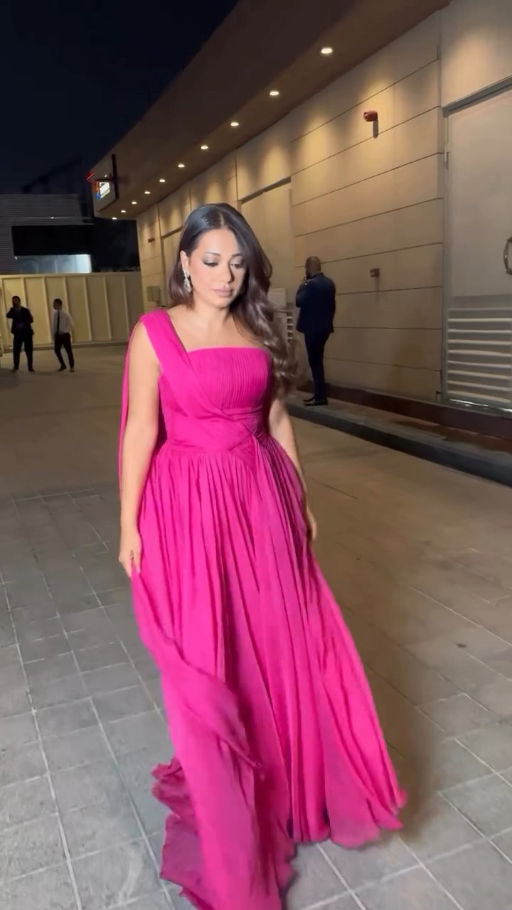 بخيار جريء ومشرق، اختارت رحمة رياض فستاناً فوشيا تميّز بقصة الكتف الواحد وملمس ناعم من القماش المنسدل. التصميم أبرز الخصر بقصّة ضيّقة في الأعلى، بينما انفتحت التنورة تدريجياً بحركة خفيفة، مما منح الإطلالة توازناً أنثوياً بين الحيوية والرقي.