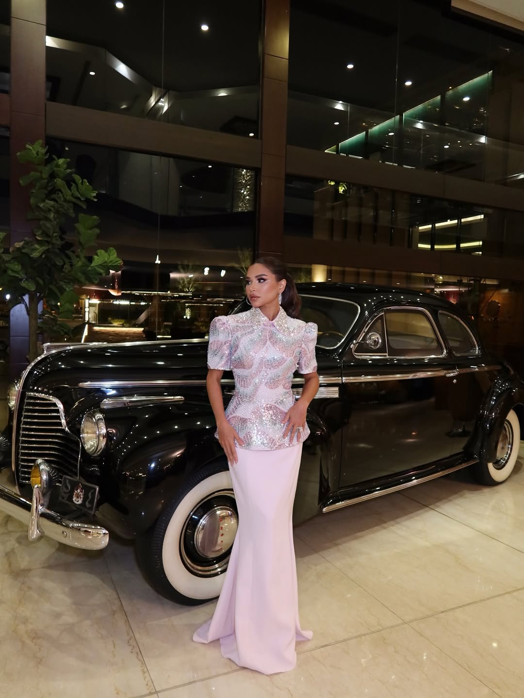 بطابع رومانسي أنيق، ظهرت نهى نبيل بفستان مستوحى من أجواء القصص الحالمة، من تصميم نهى طوق. التصميم جمع بين الزهري الباستيلي والفضي، مع ياقة عالية وتفاصيل براقة في الجزء العلوي. التنورة جاءت بقصة حورية البحر، ما منح الإطلالة طابعاً ساحراً يعكس الذوق الرفيع.
