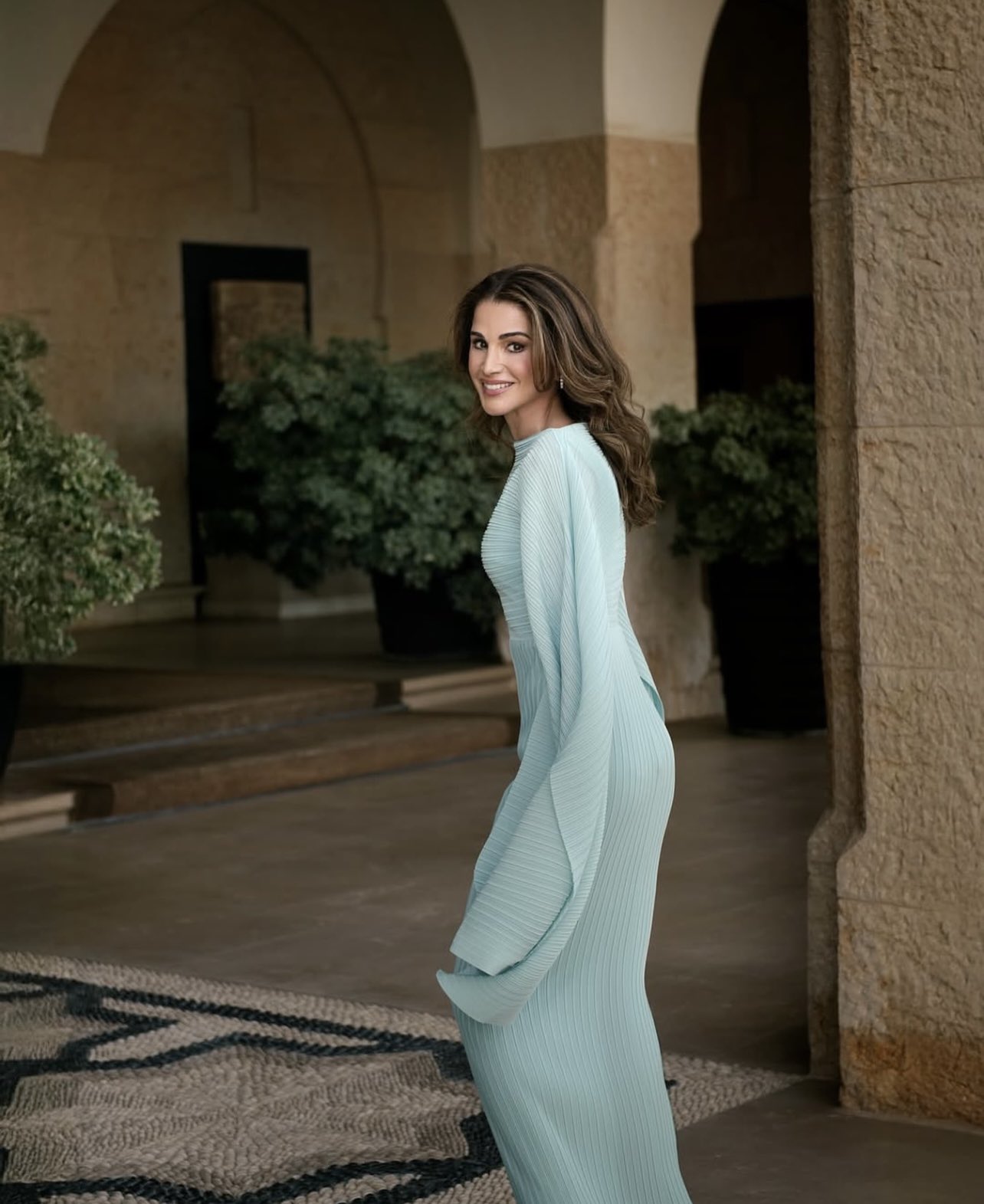 واختارت الملكة الأردنية تصميماً انيقاً يعكس حضورها الآسر وأناقتها الملفتة في كل المناسبات، وتألقت بفستان طويل حمل توقيع دار Solace London، وتميّز بتصميمه الأنيق الذي يجمع بين الكلاسيكية الناعمة والأناقة الفخمة، إضافة الى لونه الأزرق الثلجي الفخم.