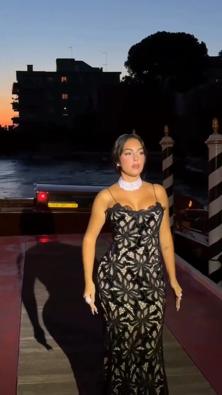 في أول ظهور علني لها بعد إعلان خطوبتها، صعدت جورجينا إلى أحد القوارب المائية في البندقية وظهرت بإطلالة كلاسيكية حالمة. ارتدت فستاناً أسود متوسط الطول من أوسكار دي لا رنتا، مزيّناً بتفاصيل دانتيل أنثوية، نسّقته مع كعبٍ أسود أنيق. واعتمدت تسريحة شعر مضفور أضافت لمسة ملكية الى إطلالتها، وأكملتها بقطع من المجوهرات الماسية اللامعة، فبدت كأنها خارجة من لوحة فنية فاخرة.