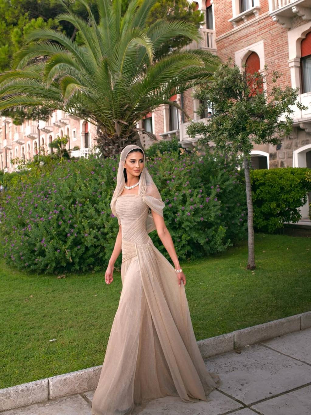 اختارت الشابة السعودية أن تبرز أناقتها بأسلوب يعكس الهدوء والابتكار معًا، من خلال فستان يحمل توقيع المصمم اللبناني رامي قاضي بلون البيج المحايد وتميز بتصميمه البسيط في قصّته، لكنه غني في تفاصيله. جاء الفستان بلا حمالات وبتصميم ضيق عند الصدر والخصر مع ثنيات لطيفة تبرز رشاقتها، بينما انسدل بأناقة ناعمة نحو الأسفل بطبقات من القماش الفضفاض.