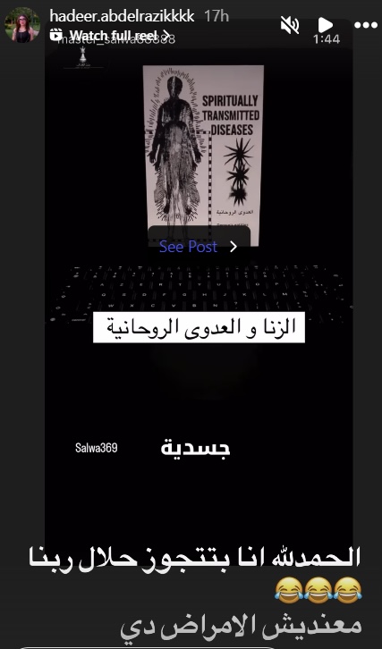 ثم نشرت هدير فيديو آخر يشير الى الأمراض التي قد تُصاب بها السيدات في العلاقات المتعدّدة خارجة إطار الزواج، ودوّن على المقطع المصوّر عنوان "الزنا والعدوى الروحانية"، ولكن هدير علّقت على الفيديو قائلةً: "الحمد لله أنا بتجوز بحلال ربنا معنديش الأمراض دي".