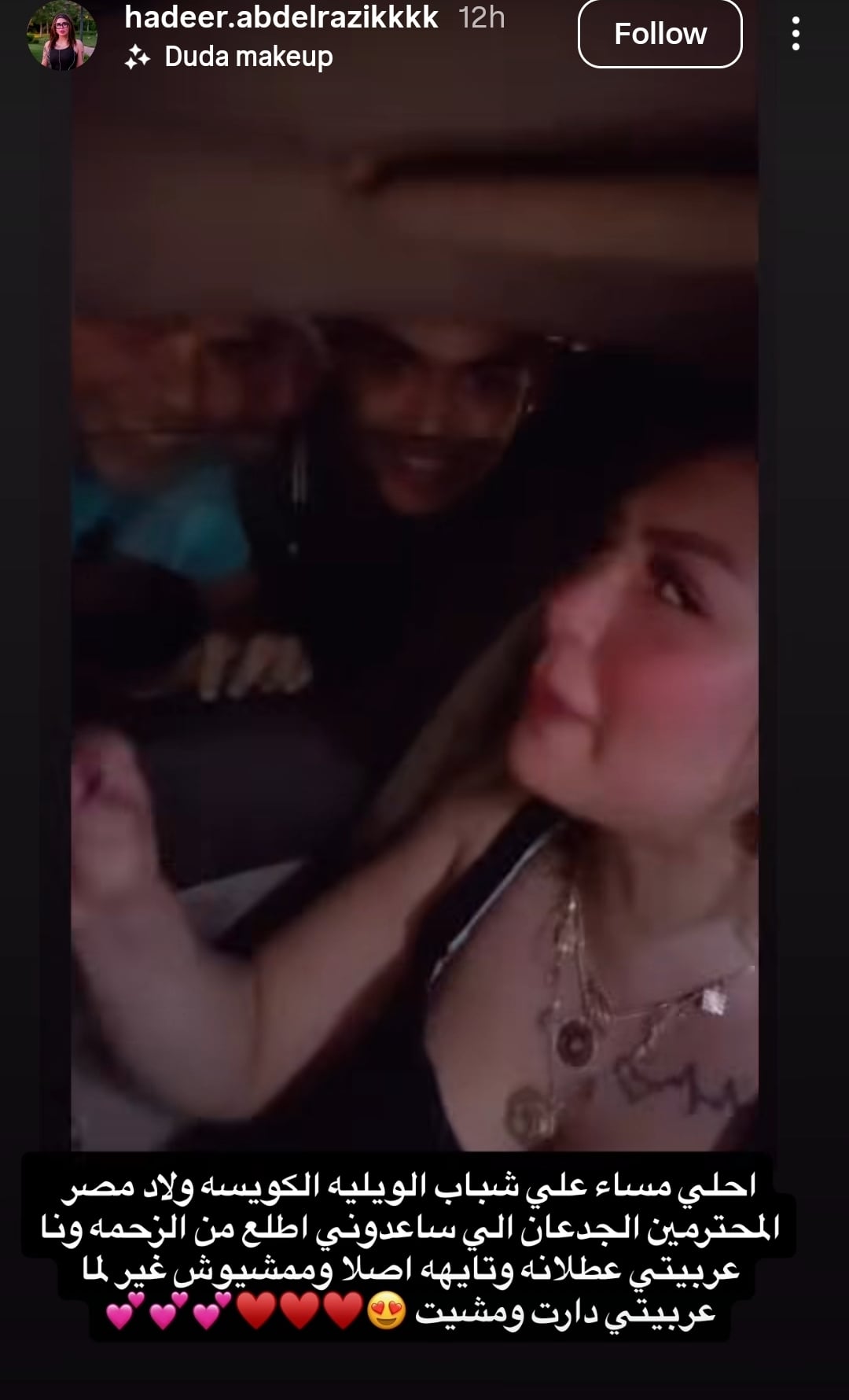 وشاركت هدير أخيراً فيديو ظهرت فيه بداخل سيارتها ومحاطة بمجموعة من الشبان، وحرصت على توجيه التحية إليهم بعد مساعدتها على تخطّي الزحمة، وعلى تشغيل سيارتها المعطّلة من جديد، مقدمةً من خلال الفيديو تحيةً الى الشباب المصري الشهم.