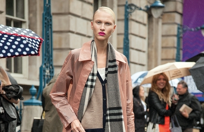 ارتدت هذه الشابّة سروالاً من الجينز المنقوش «باتشوورك»، مع تي شيرت باللون الأبيض وكنزة خفيفة يلتقي فيها البيج والأسود مع سترة للمطر ووشاح من Burberry، وحملت حقيبة واسعة من جلد الشاموا. ثيابها ملائمة ليوم ممطر، ما عدا الصندل المفتوح، أما شفتاها فلونتهما بالفوشيا الذي يضيف المرح إلى طلّتها!