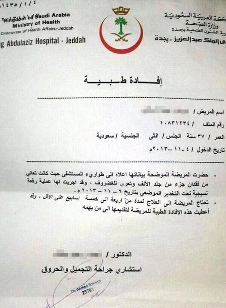 عندما وصلت الزوجة إلى المستشفى، استقبلها الأطباء وباشروا علاجها، ليتبين بعد الكشف أتها فقدت الجلد الخارجي وتحرّك الغضروف، وحدث شق غائر في الأنف بسبب القضم. وتقرر إخضاعها لثلاث عمليات تجميلية، لتبقى في المستشفى 17 يوماً.
