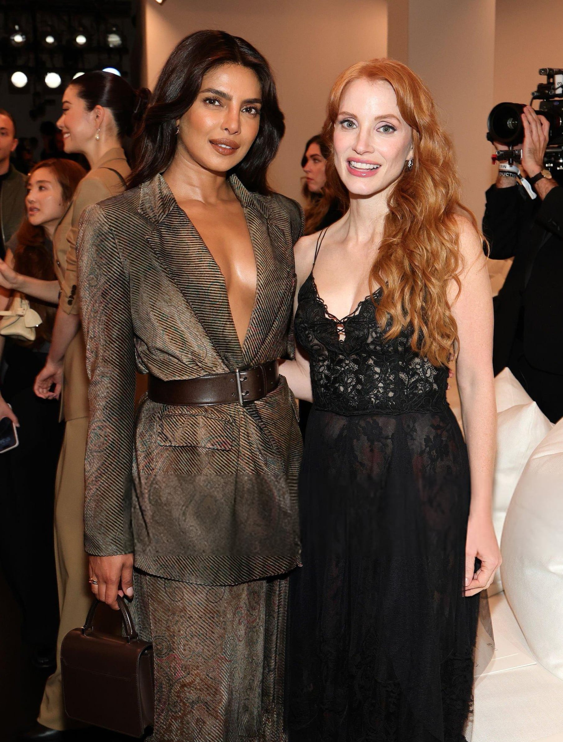 كانت بريانكا شوبرا من أوائل النجمات اللواتي حدّدن الطابع الموسمي لشهر الموضة. قبل أن تجلس في الصف الأمامي، وقفت أمام المصوّرين بإطلالة كاملة من "رالف لورين". استعارت الممثلة الإطلالة 18 من مجموعة رالف لورين لخريف وشتاء 2025: طقم تنورة بنقشة البايزل. بدت الإطلالة أنيقة ومُهترئة في آنٍ واحد، من السترة المبطّنة بالأكتاف إلى التنورة البرارية. أضفى تأثير الأومبري على طيّات صدر السترة والحواف لمسةً جرونجيةً مُفاجئة - وهو نقشٌ مُستخدم في مجموعة عروض الأزياء الأصلية. ربطت سترة البدلة ذات الطابع الكئيب بحزام بنّي سميك، مُستوحيةً من عارضة الأزياء. استبدلت شوبرا إطلالتها العارية بقميصها التقليدي ذي الأزرار.