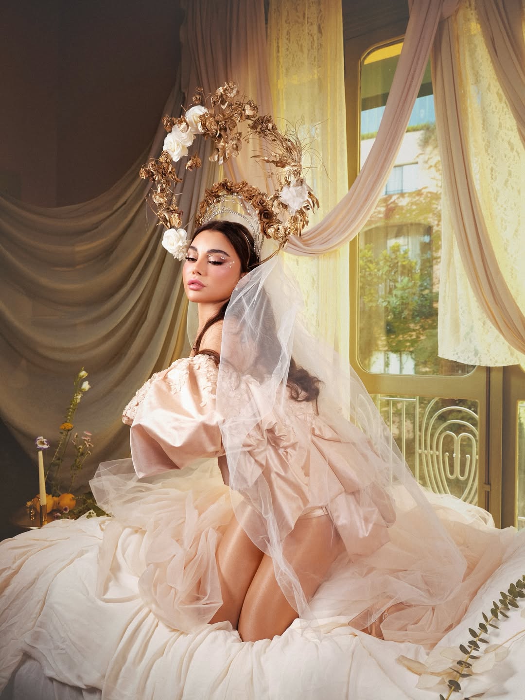 ولم تكتفِ هيفاء بالتصميم الجريء، بل نسّقت معه إكسسوار شعر ضخماً ولافتاً على شكل ورود ذهبية وبيضاء زيّنت به شعرها بطريقة استعراضية ومميزة. هذا الإكسسوار أضفى بُعداً ملكياً على الإطلالة، وذكّرنا بأسلوب نجمات هوليوود على السجادة الحمراء، حيث تتلاقى الأناقة مع الفانتازيا.