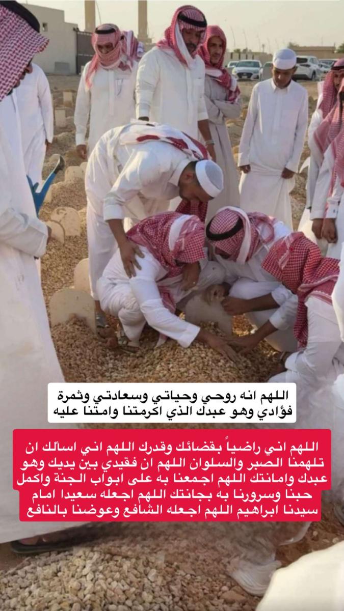 وصُلّي على جثمان الطفل عصر السبت الماضي في مسجد الراجحي بمدينة الرياض، قبل أن يُوارى الثرى في مقبرة النسيم، فيما تُقام مراسم العزاء في منزل شقيقه عبد الله في حي القيروان.