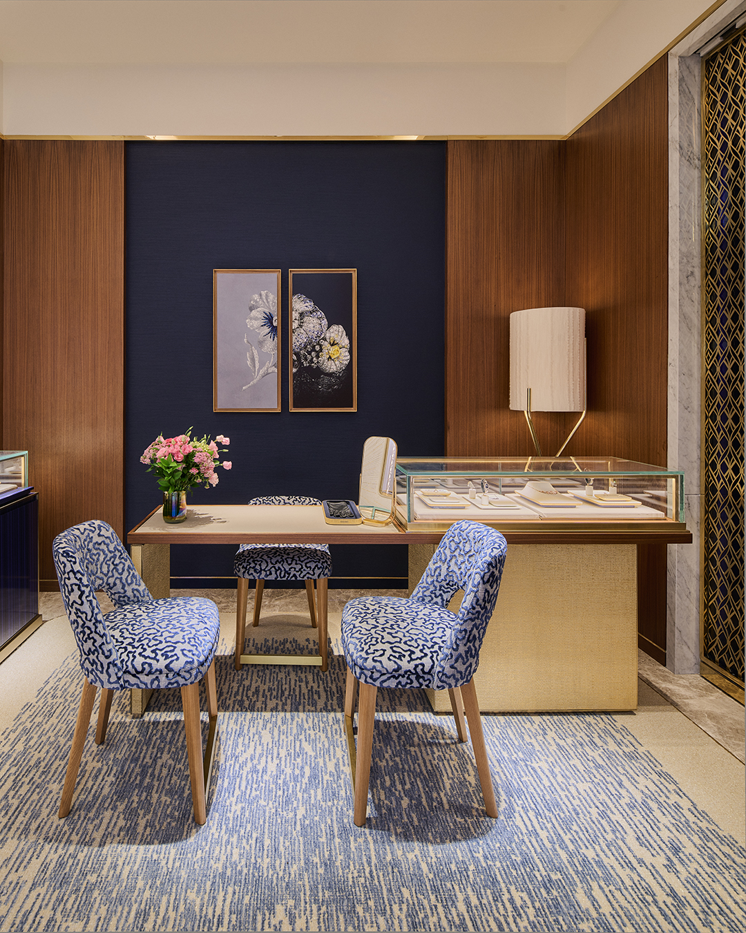 عند دخولكم إلى المتجر الجديد، يستقبلكم جو هادئ وراقٍ تكشف عنه الواجهة الزرقاء المُميّزة التي تُذكّر بالأناقة الباريسيّة عبر رموز تحمل توقيع الدار. تمّ تصميم كل التفاصيل لتستحضر تقاليد "شوميه" وخبرتها في مجال المجوهرات مع مصادر إلهام عصريّة. تتزيّن المساحة بمشربيّة ذات أنماط رقيقة مستوحاة من مجموعة Liens "ليان".
