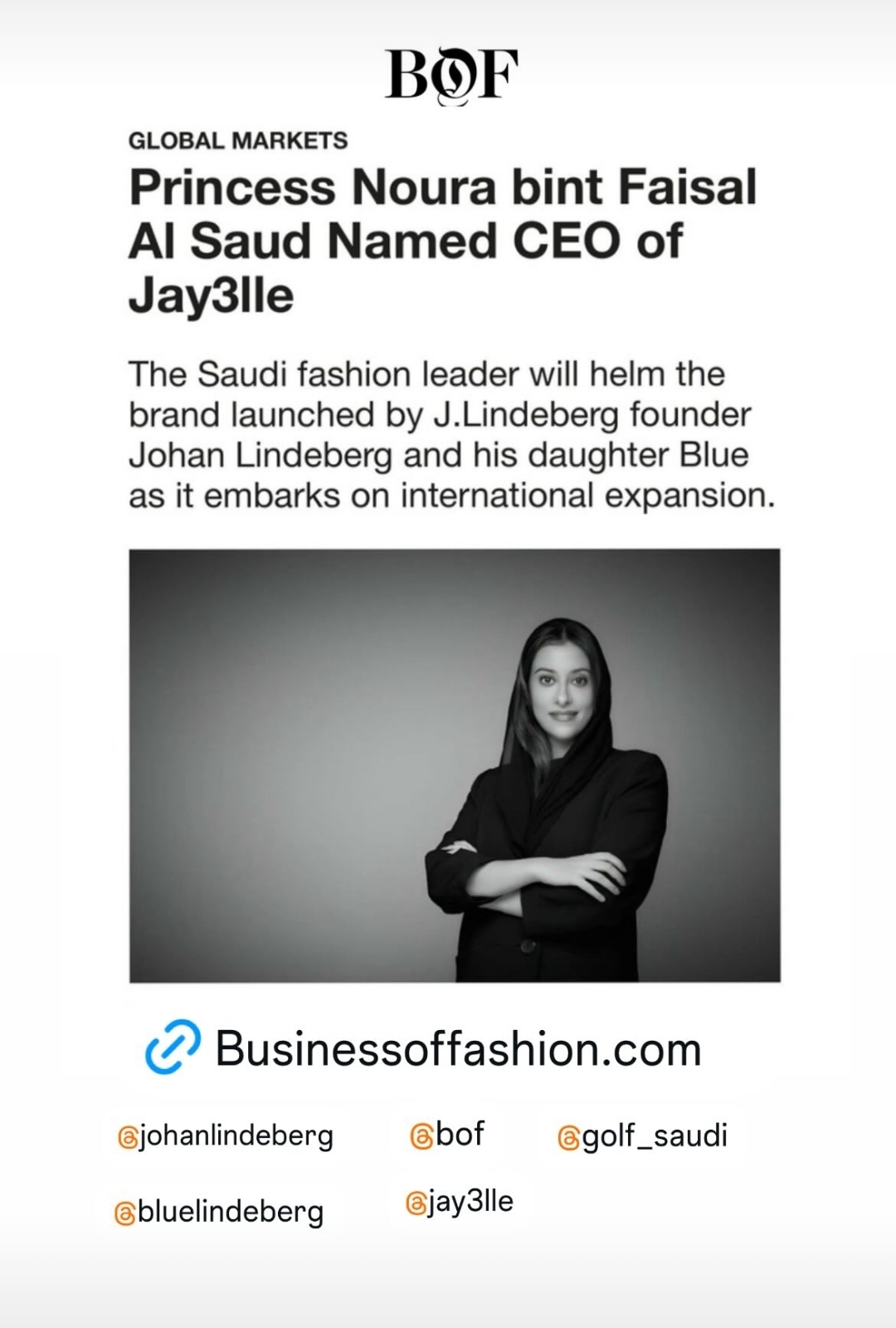بدوره، قال يوهان ليندبرغ، المدير الإبداعي والمؤسّس المشارِك لـ JAY3LLE: "وجدت في صاحبة السمو الأميرة نورة بنت فيصل آل سعود شريكاً مثالياً للعلامة وقيمها وتطلعاتها، ويُسعدني تولّيها منصب الرئيسة التنفيذية، إذ تمثل مصدر إلهام يشع بالطموحات العالية بفضل شخصيتها الريادية المفعمة بالحياة. كما أنّ انضمام سيدتين موهوبتين مثل سمو الأميرة نورة وبلو، يشّجعنا على تقديم علامتنا من منظور أنثوي يلبي تطلعات عاشقات الموضة".