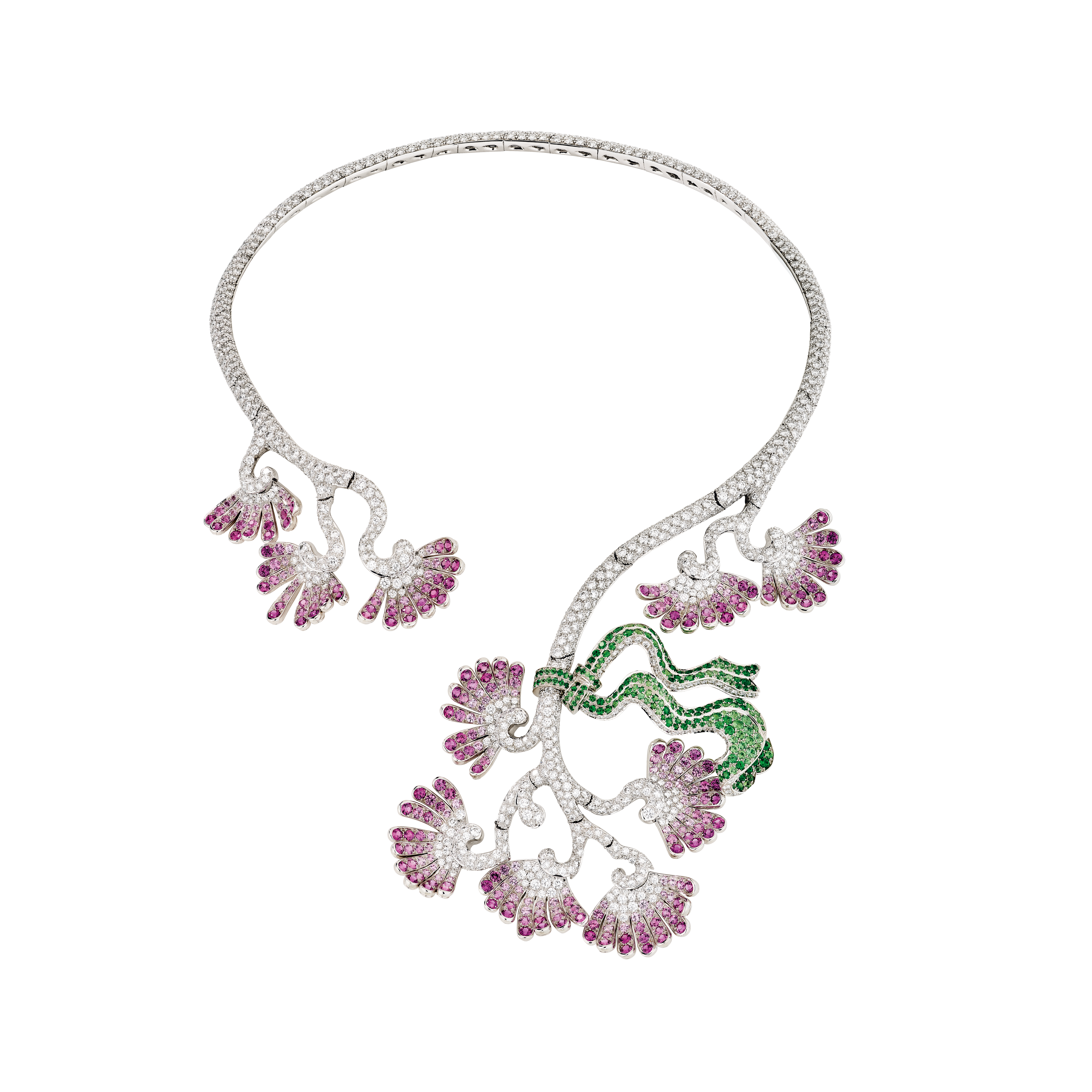 عقد "أوميكوجي" 2008 ذهب أبيض، سافير زهري، تسافوريت، ماس مجموعة المجوهرات الراقية "لي جاردان" مجموعة "فان كليف أند آربلز"