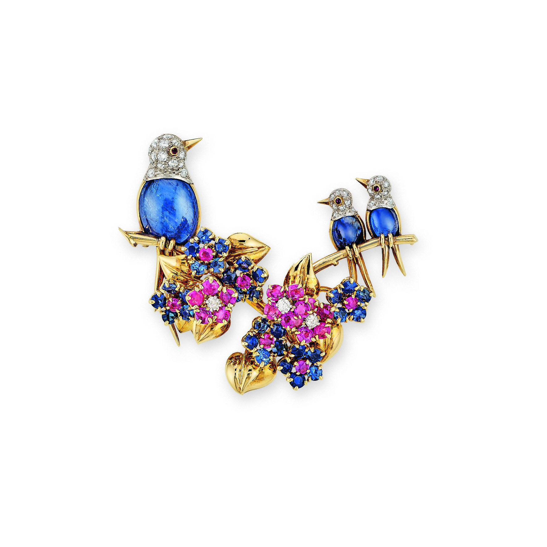 مشبك "ثري بيردز" 1946 ذهب أصفر، بالتين، ياقوت، سافير، ماس مجموعة "فان كليف أند آربلز"