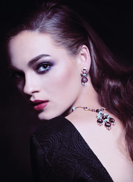 بشرة مخملية، فيما يتلون الجفن والفم بظلال ذات أصباغ مستوحاة من الحجارة النفيسة ولمعانها الساطع. أضيفي المجوهرات الراقية، وستكون النتيجة ساحرة حتماً.