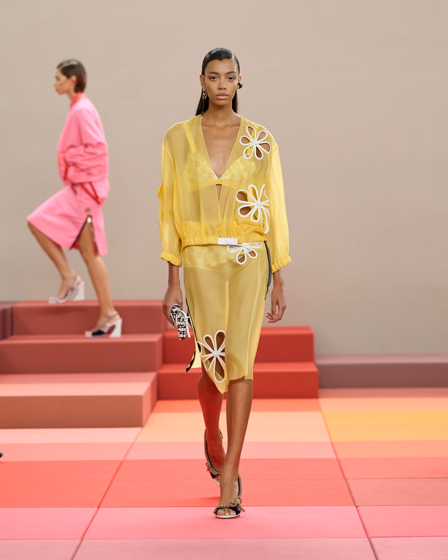 الورود ليست جديدة على منصات الموضة، لكنها هذا الموسم ظهرت لدى فندي بروح جديدة أكثر فنية وتجريدية. رأينا الورود مطرزة بدقة على الأقمشة الفاخرة، وأحياناً مطبوعة بأسلوب شبه ثلاثي الأبعاد، ما أضفى على التصاميم طابعاً شاعرياً مع لمسة عصرية.