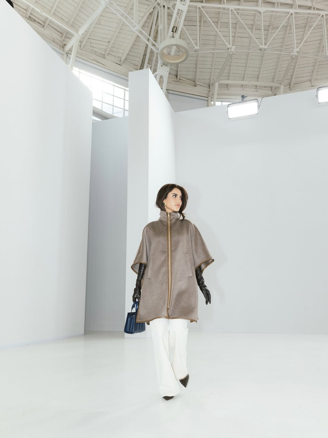 اختارت نجود الرميحي إطلالة أنيقة وواسعة تعكس الراحة والفخامة، مع معطف بيج وبنطلون أبيض. أضافت قفازات جلدية سوداء وحقيبة كحلية، ما منح الإطلالة لمسة درامية أنيقة دون مبالغة.