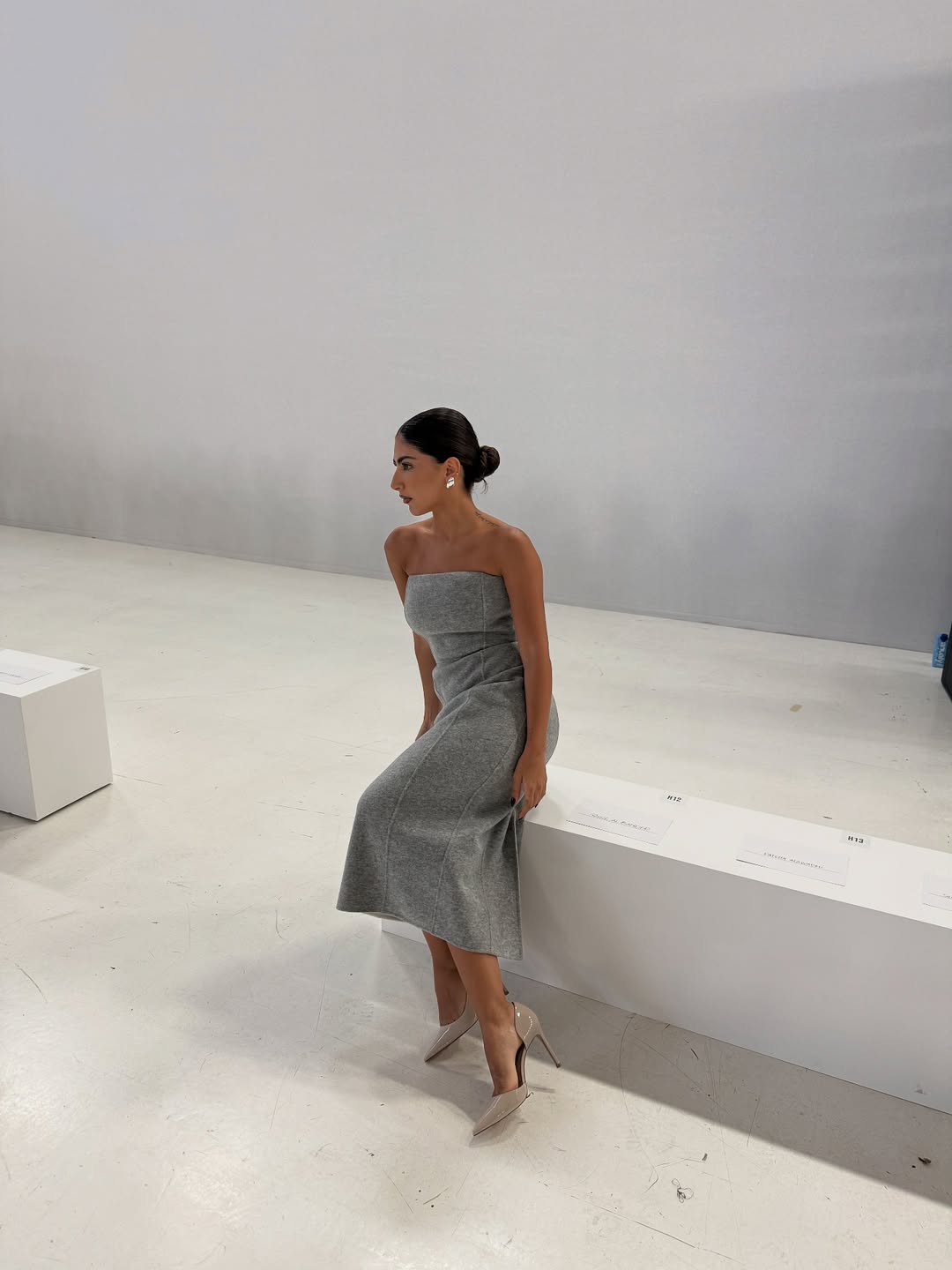 في عرض ماكس مارا، ظهرت شوق بفستان ستربلس ميدي رمادي يعكس الكلاسيكية الناعمة. نسقت الفستان مع حذاء Pump باللون الغريج اللماع، ما أضفى لمسة من التوازن بين النعومة والقوة.