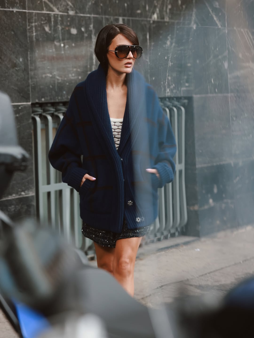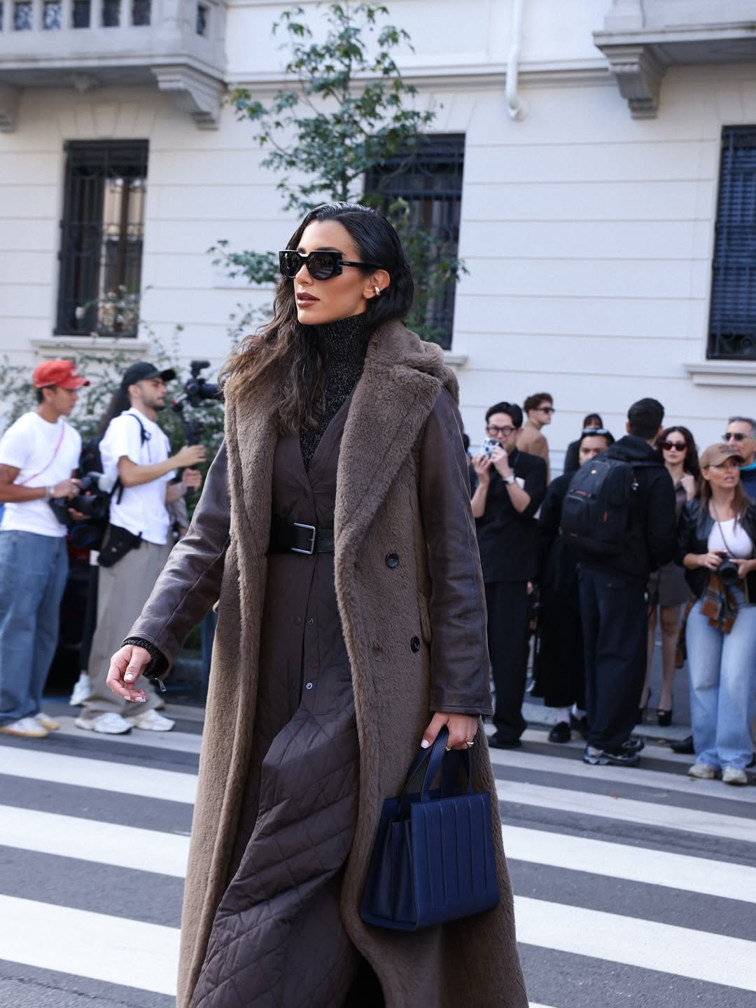 اكتملت الإطلالة بـ نظارات شمسية سوداء بارزة وحقيبة أنيقة من الدار، مما عكس طابعاً شتوياً فاخراً.