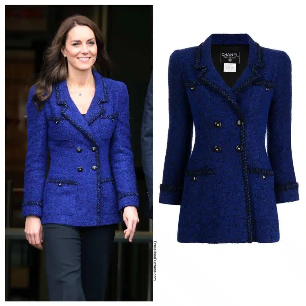 سترة كيت الكلاسيكية المصنوعة من مزيج الصوف من البوكليه، وهي سترة بلون الجواهر تعود إلى عام 1995 تقريباً، لم ترتدِها الأميرة إلا في مناسبتين. نسّقت كيت المعطف الأزرق الجريء مع بنطالها الأسود واسع الساقين من رولان موريه "أكسون" في نزهة في تشرين الأول/أكتوبر 2002 في فعالية "كوتش كور". بعد شهر، ارتدت إطلالة دبلوماسية زرقاء بألوان بوسطن أثناء زيارتها لماساتشوستس لحضور مباراة كرة سلة لفريق "سيلتيكس". كما شوهدت عارضة الأزياء الشهيرة كلوديا شيفر مرتديةً سترة التويد على منصة العرض في أوائل التسعينيات. كان سعر سترة التويد الزرقاء من "شانيل بوتيك" في الأصل 4698 دولاراً أميركياً.
