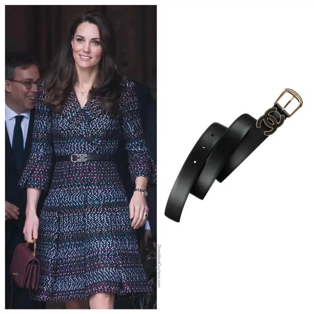 لعبت الأميرة دور "باربي شانيل" في باريس مرتديةً هذا الحزام الجلدي الأسود من جلد العجل، والذي يحمل شعار "شانيل التجاري": حرفان كبيران متشابكان من حرف C. ارتدته كيت في آذار/ مارس 2017 فقط، وكان بمثابة اللمسة النهائية المثالية لإطلالتها الباريسية الأنيقة.